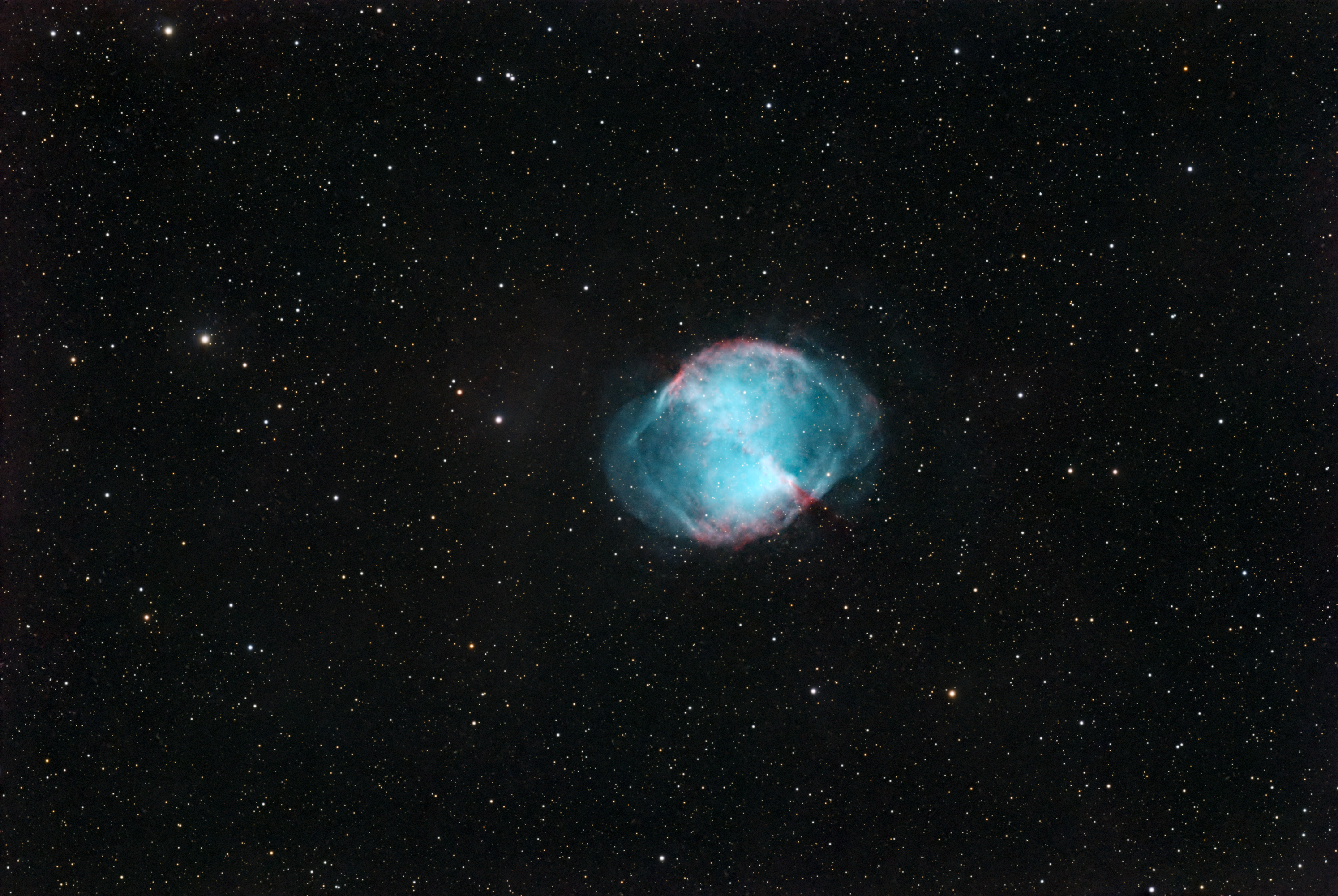 M 27, der Hantelnebel. Aufgenommen mit einem Celestron C8 EdgeHD, Celestron CGX Montierung, 73*120s belichtet. Aufgenommen in Hennef. Bearbeitung mit PixInsight, RC-Astro Tools und Affinity Photo.